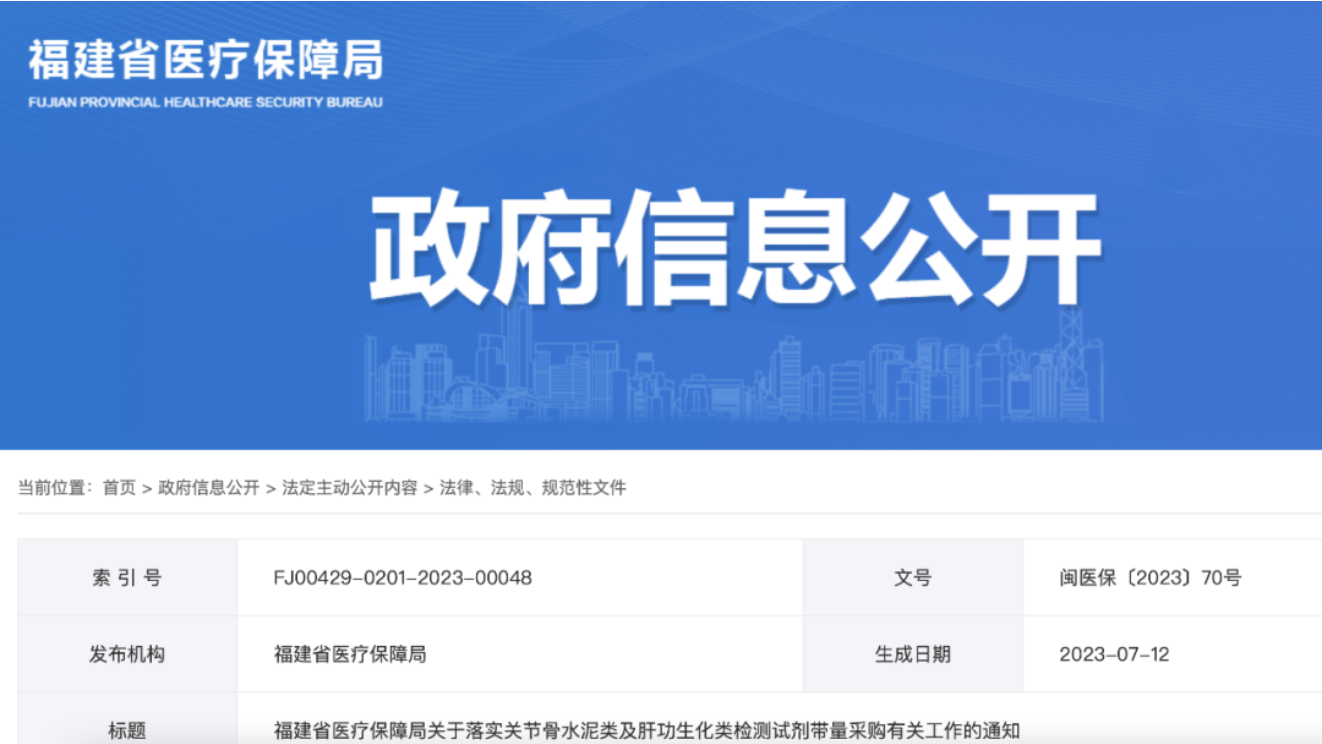 近日,福建醫(yī)保局發(fā)布《關(guān)于落實(shí)關(guān)節(jié)骨水泥類(lèi)及肝功生化類(lèi)檢測(cè)試劑帶量采購(gòu)有關(guān)工作的通知》(簡(jiǎn)稱(chēng)《通知》)。